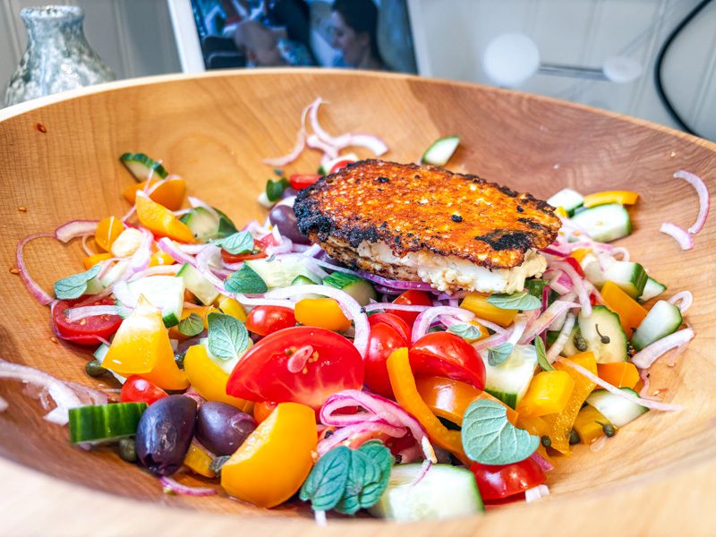 I love Greek salad – cool cucumbers, ripe tomatoes, crisp peppers, tangy olives, sour red onion, salty capers . . . how it possibly be improved? PAN FRIED FETA. Greek salad with pan fried feta is the only way to take an amazing salad – and make it even better (without sacrificing healthy!).