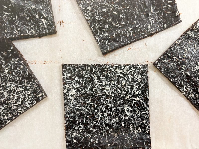 Inspired by the Honey Mama’s chocolate cake truffle bar: made with cocoa, honey, coconut oil, coconut, pecans, vanilla, salt. Plus, it’s free from refined sugars, gluten, dairy, and soy. I’ve recently become obsessed.