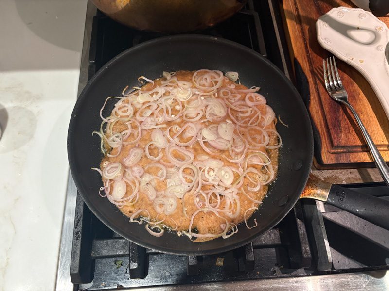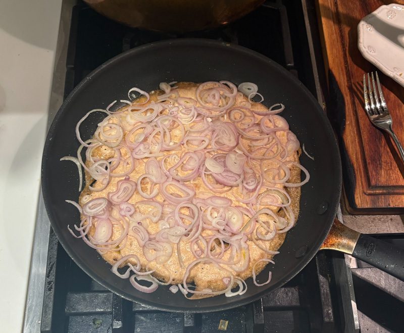While the starter begins to cook, thinly slice a shallot or onion until you have 2-3 tbsp of thinly sliced shallot/onion. Break them up a bit and generously sprinkle them over the starter.