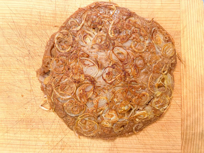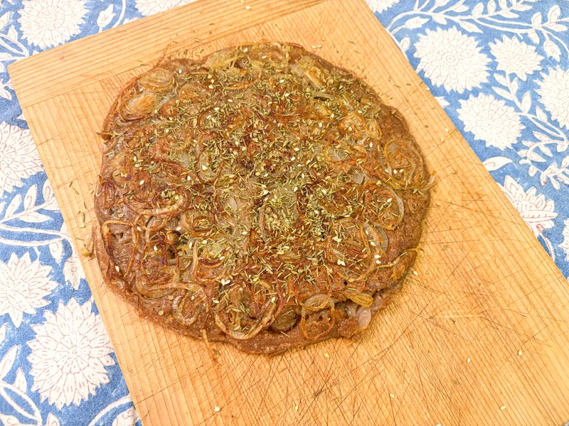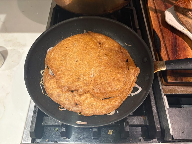 It can be difficult to peek under the flatbread, so sometimes I just grab my wooden cutting board and put it next to the stove. I grab my pan and flip the flatbread down directly onto the cutting board. So the flatbread comes out onto the cutting board with the onion side up. If the onion hasn’t picked up much color, return the flatbread to the pan, onion side down, and turn the heat up slightly. Let it cook for 2-3 more minutes.