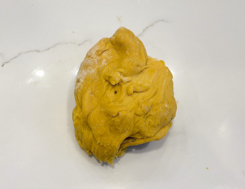 Step 2: Plop your dough directly on top of the freshly dusted counter. If the dough is super sticky, you can dust the top with a bit of flour too. But try not to use more flour than you absolutely need.