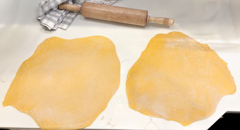Dust each portion with flour and roll out until 1/8 – 1/16 inch thick, using flour as needed to ensure the sheets do not stick to the rolling pin or the counter surface. I usually do about 5 rolls with the rolling pin, apply a bit of flour to the top, flip over the dough, roll about 5 more times, and repeat the process.