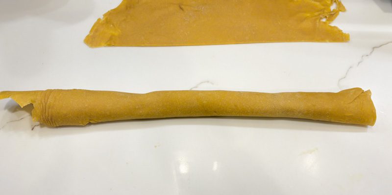 After you’ve finished dried the noodle sheets for about 2 hours (as described above), cut each of the two dough sheets down the middle, so you have a total of 4 sheets. With the longer side of the noodle sheet toward your body, roll up the sheet of noodles (hotdog style – you want a long roll, not a short one, so that you cut lots of relatively short noodles, not a few very long noodles).