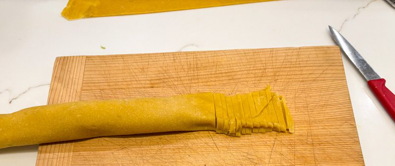 Then slice the rolled up noodle sheets so that you have noodles between 1/4 and 1/8 of an inch thick. My sweet spot is about 3/8 of an inch.