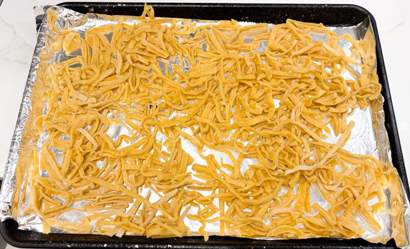 Alternatively, allow the noodles to dry on the baking sheet. Toss them every 4-5 hours to ensure they fully dry. After about 1-2 days of drying (err on the side of longer), you can store them in an airtight container at room temperature. To cook from dry, they will take about 10-13 minutes, depending on thickness.