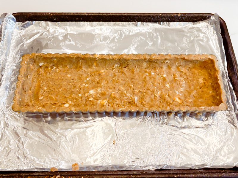 Again, recommend leaving the tart pan on a baking sheet while you bake it. Makes it much easier to move in and out of the oven without risking breaking the crust.