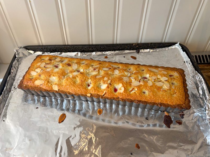 The frangipane will turn golden brown when it is finished. A fork / toothpick should come out clean. Allow the tart to cool for at least 20 minutes before you take off the outer part of the tart pan. The crust will get a bit harder as it cools making this process easier.