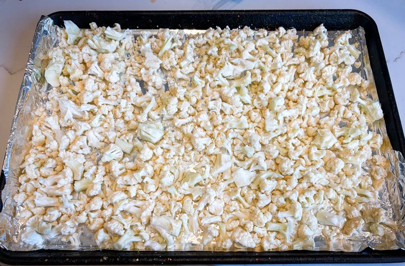 Using your fingers, break apart the cauliflower into small pieces. You want some tiny pieces, some small pieces, and some small-medium pieces. Nothing too large, because it won’t crisp up as well and will get a bit mushy. Once everything is broken up, spread it out evenly across the sheet in one layer. If you have too much cauliflower to spread in an even layer, use another sheet. Having one layer is critical to get the crispy crunchy effect.