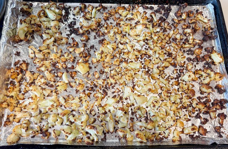 If you remove the cauliflower from the sheet and pile it onto a plate before it cools a bit, it will steam itself so that the crispy parts lose their crispy crunchy texture and turn into mush. So don’t skip the rest period! If you need to eat right away, eat it off of the sheet pan. I’m serious!