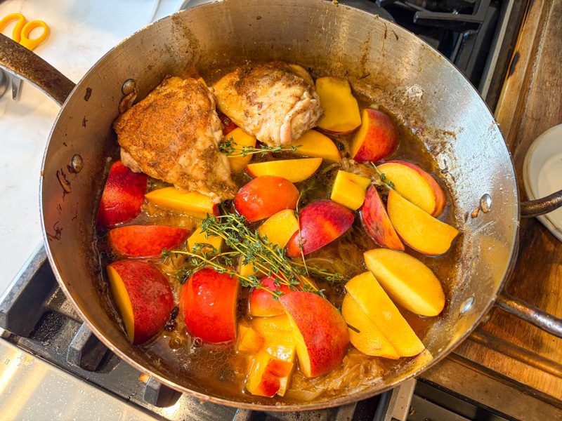 I have more theories on how to make that sheet pan recipe work a bit better, and I’m going to keep trying. But one evening I was staring at several sad mealy peaches and also happened to have a bunch of bone-in, skin-on chicken thighs. It was also a hot day, and I did not particularly want to turn on the oven.
