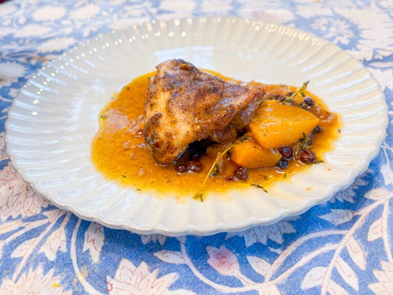 These summertime chicken thighs with peaches and thyme are cooked on the stove – no oven required! They’re naturally sweetened with caramelized onions and currants and braised in sherry. Bonus: they’re a great way to use up hard or mealy peaches!